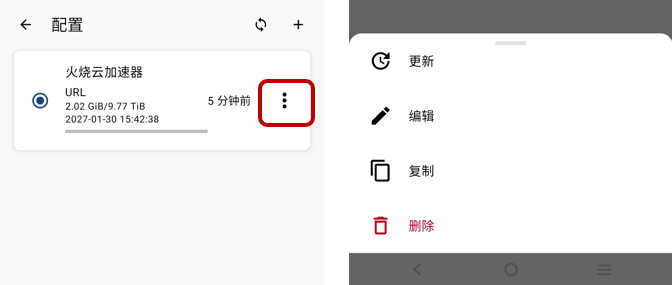 进入【配置】,点选【火烧云加速器】右侧【··· 】三个点,可删除该加速器。