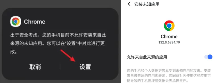 若跳出警示通知无法安装,请前往手机设置,开启「允许安装未知应用」的权限。