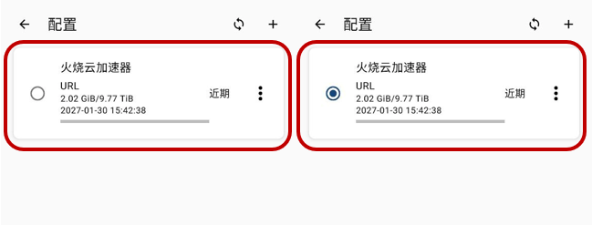 返回 Clash Meta 主页,进入【配置】处,选择并激活火烧云加速器。